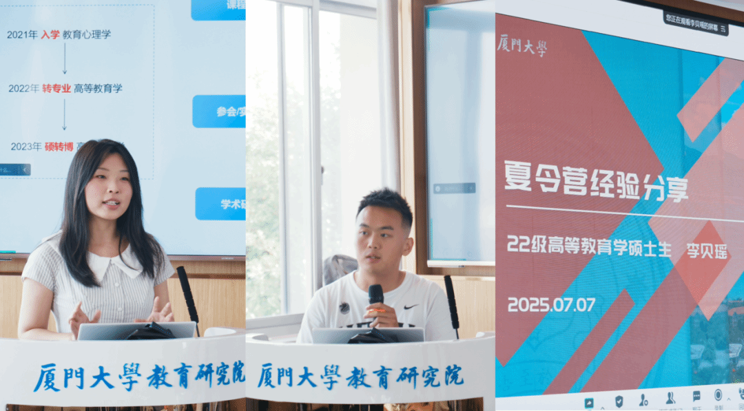 7月7日下午,我院2023级博士研究生吕榭、2023级硕士研究生刘倩、2024级硕士研究生黄诗茹、2024级硕士研究生唐晓宇、2021级硕士研究生何子耕以及2022级硕士研究生李贝瑶六位学生代表依次分享了他们在厦门大学教育研究院的学习生活,并围绕学术发展、创新创业竞赛、职业发展、学生工作、考公经验、厦大生活等话题,为营员们提供经验与建议,细致地解答营员的问题。