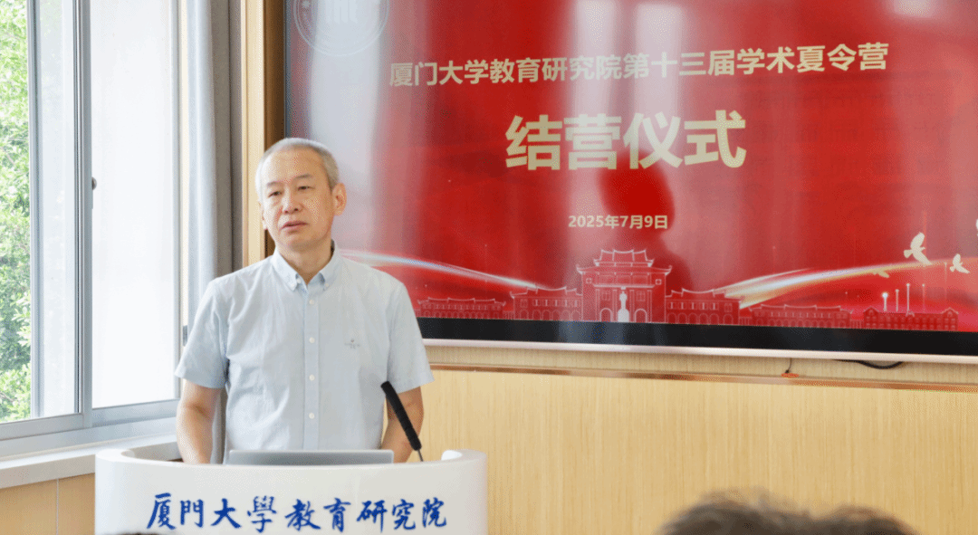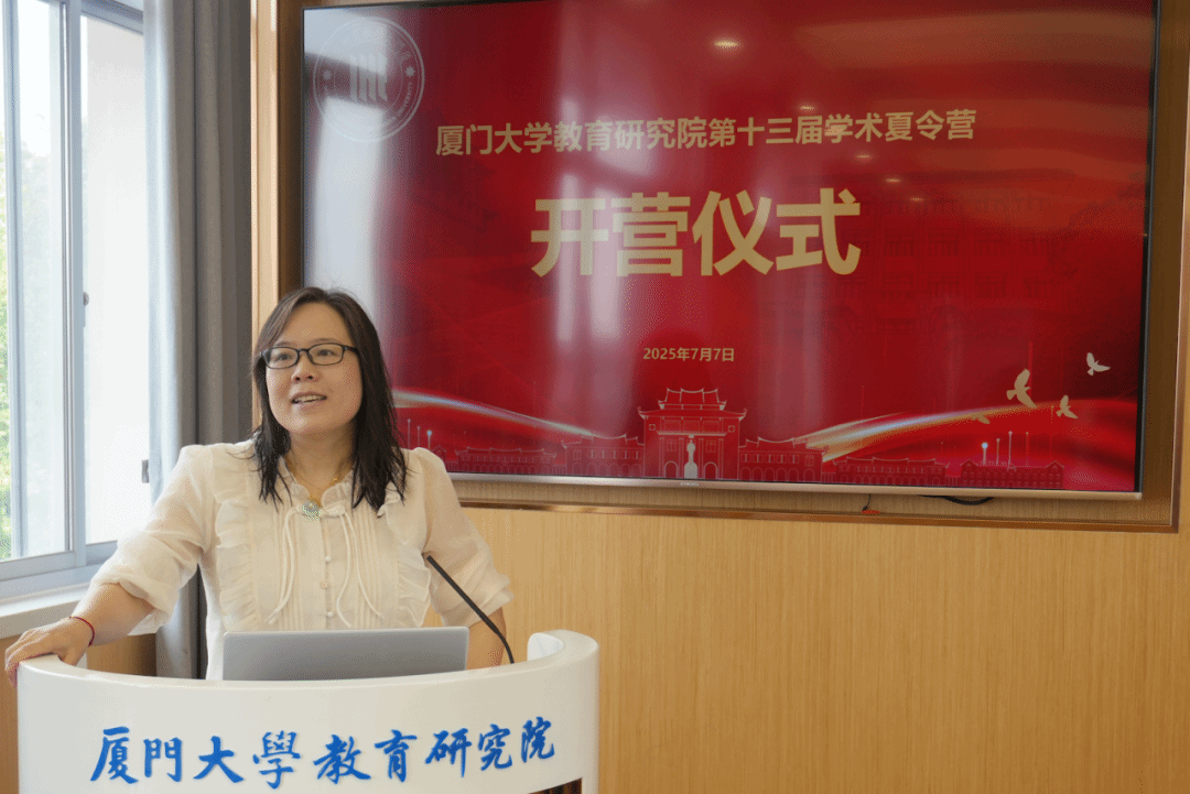 仪式伊始,副院长覃红霞教授作结营总结发言。她对营员们在学术活动中的出色表现给予高度肯定,感谢大家对厦门大学的关注与支持。覃红霞教授勉励同学们在技术变革的时代浪潮中坚守教育初心,保持学术热情,以研究的深度回应时代挑战。她表示,教育研究院将持续推进一流学科建设,期待大家将来加入这片充满希望的沃土。最后,她祝愿大家前程似锦,并诚挚邀请营员们明年九月重返厦园,继续追寻学术梦想。