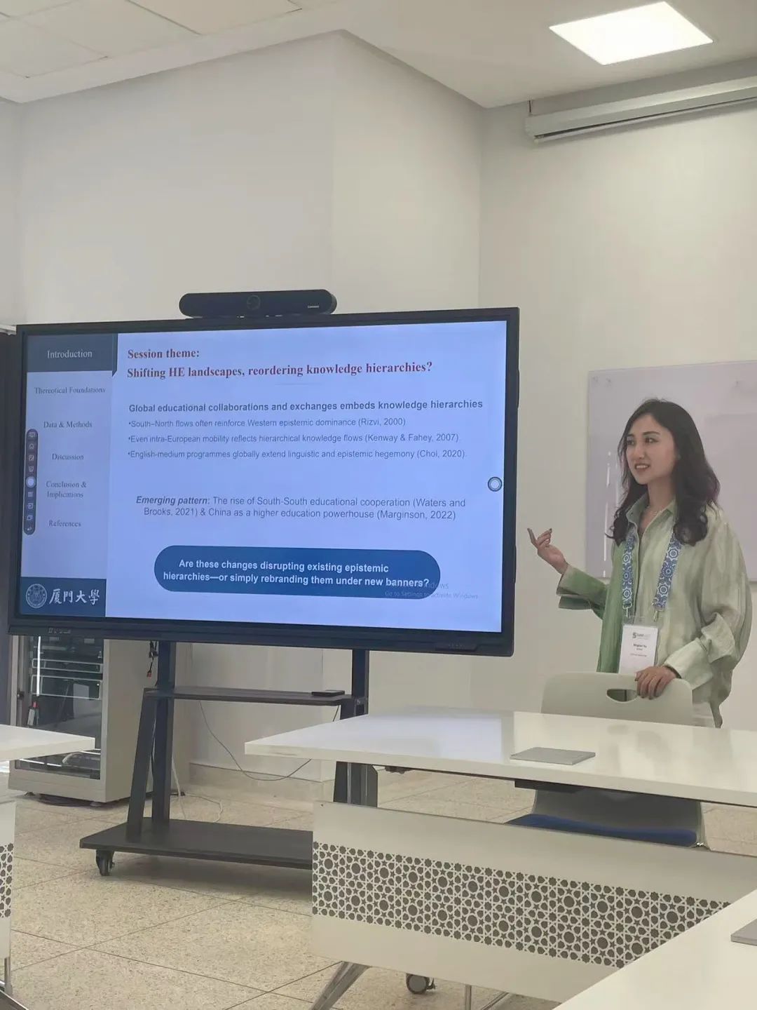 同日下午,余婧然在由牛津大学Rachel Brooks教授与萨里大学Vera Spangler教授联合组织的小组论坛“国际学生流动与知识秩序的争夺”(International Student Mobility and Contested Knowledges)中,报告了题为“Competing Imaginaries and Renegotiating Knowledge Hierarchies: International Student Experiences and Perceptions at a Chinese Branch Campus in Malaysia”的会议论文。该研究基于在厦大马来西亚分校的田野调查数据,在知识地缘政治的理论透镜下深入分析了国际学生在后殖民语境中协商、回应乃至重构以西方为中心的知识等级秩序的能动性策略。报告回应了本届年会关于知识正义的核心议题,获得了与会学者的积极回应与深入讨论。此次参会不仅展示了我院学者在社会学与跨境高等教育研究中的理论探索与实证积累,也进一步加强了我院与社会学跨学科全球研究网络的交流合作。