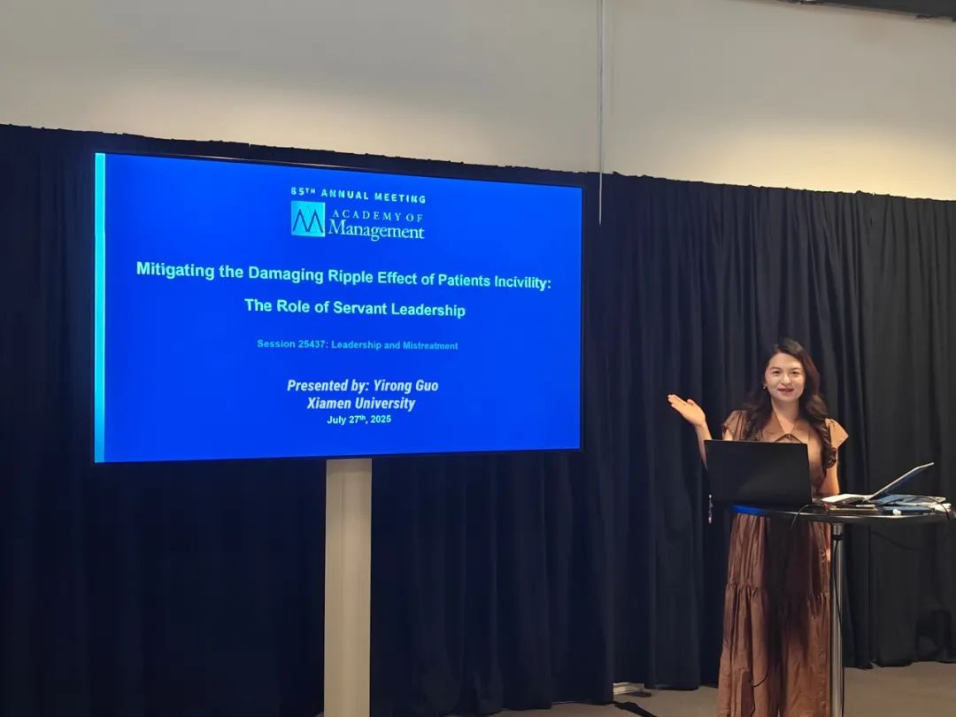 当地时间2025年7月27日上午,郭一蓉副教授与其合作者(香港大学博士研究生陈黎梅和英国利兹大学教授宋继文)在“Leadership and Mistreatment”小组论坛中做了题为“Mitigating the Damaging Ripple Effect of Patients incivility: The Role of Servant Leadership”的报告。报告通过探讨患者不文明行为对医护人员心理和行为的影响,为后续研究不文明行为如何对职场健康和家庭生活的跨界影响提供了新的视角。此外,报告还提出了服务型领导可以作为一种干预手段,减缓负面影响的传播。为了缓解这些问题,组织可以通过培养服务型领导的行为来改善员工的工作环境,从而减少因患者无礼带来的压力和负面情绪。