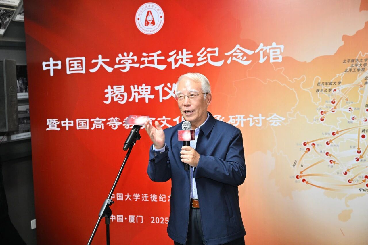 瞿振元发表讲话。他回顾了此前在厦门市翔安区黄厝村参访初建展馆的经历,指出此次纪念馆的落成是对那段历史更为集中、丰富的展示。他认为,纪念馆的意义至少体现在五个方面:传承历史文化、弘扬民族精神、深化学术研究、服务社会教育、激励继续奋斗。他特别强调,战争带来了苦难与迁徙,但也淬炼出中国大学宝贵的文化精神,其中蕴含的和平愿景、民族气节与文化坚守,尤其值得今人铭记与传承。