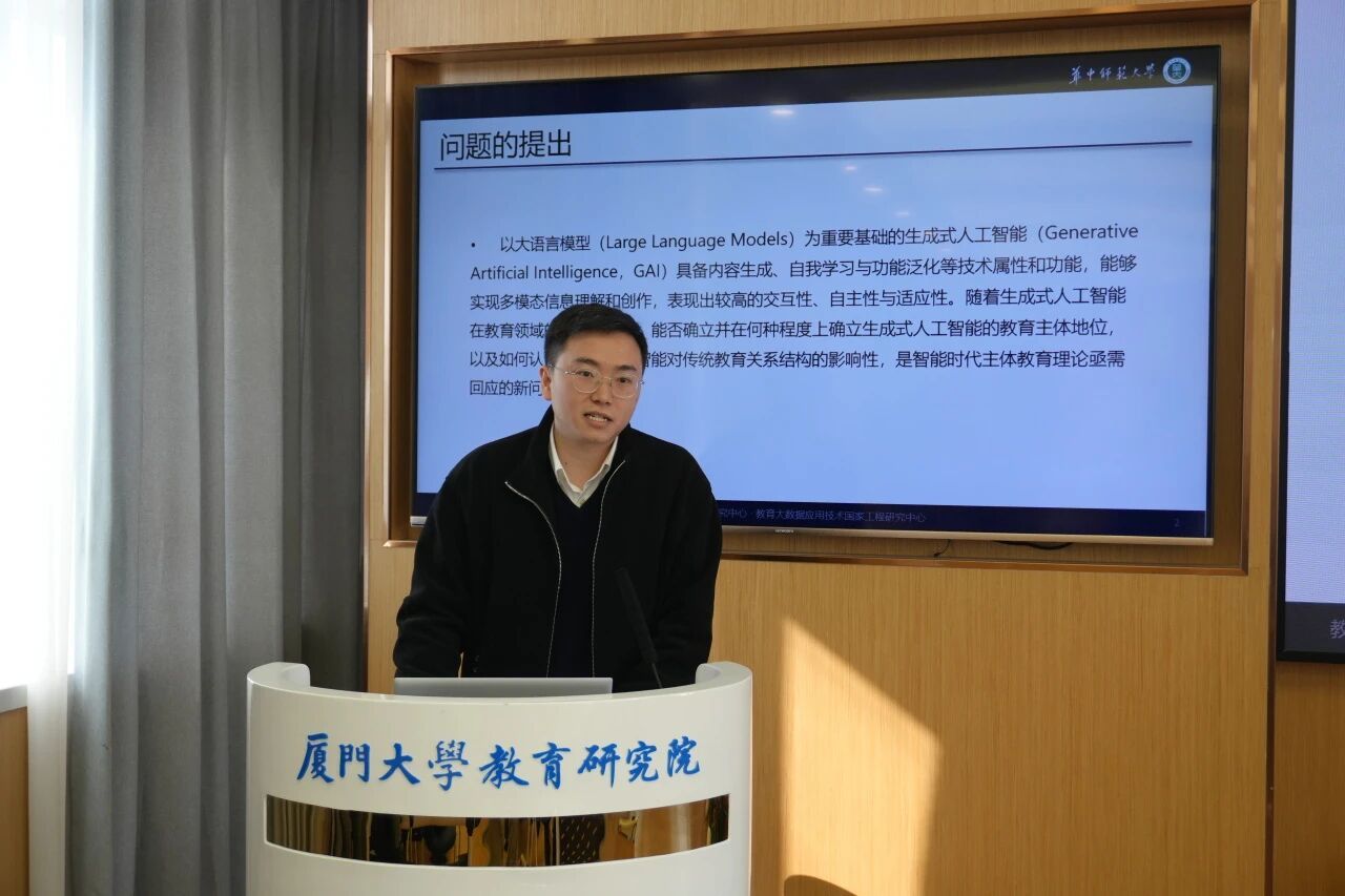 吴河江作了题为《生成式人工智能的教育主体地位辨析》的报告。他从教育主体的本质与确立标准出发,围绕生成式人工智能是否具备教育主体地位这一核心问题,系统梳理并回应了内在主体性、类主体等多重理论争议。基于“交互主体性”视角,他提出生成式人工智能在履行教育责任过程中已表现出自主性、主动性与创造性,应被确立为“有限教育主体”,并与人类教师共同构建人机协同教育新形态。研究针对教育实践中如何超越工具理性、构建人智共育模式提出了策略建议。