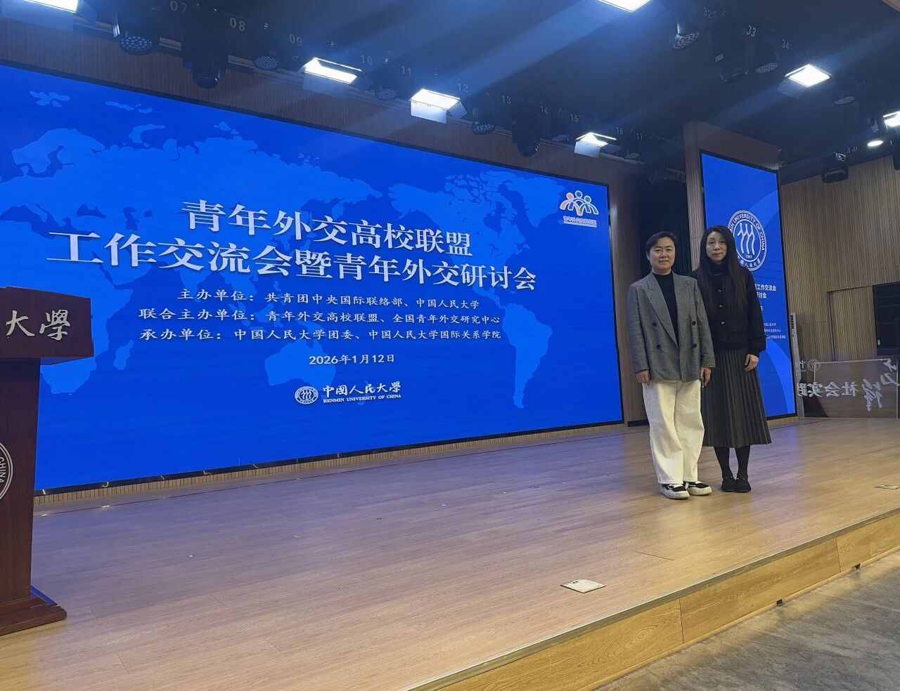 2026年1月12日,青年外交高校联盟2025年工作交流会暨青年外交研讨会在北京举办。本次大会由团中央国际联络部、中国人民大学主办,青年外交高校联盟、全国青年外交研究中心联合主办,中国人民大学团委、中国人民大学国际关系学院承办,以“践行四大全球倡议,推动青年参与民间外交”为主题。共青团中央书记处常务书记、中华全国青年联合会主席徐晓,联盟理事长、中国人民大学党委副书记、副校长王易出席会议并致辞。来自全国30所高校的80名青年学者、团组织负责人参加会议。厦门大学团委郑音副书记和高等教育发展研究中心副主任吴薇教授作为学校代表出席。