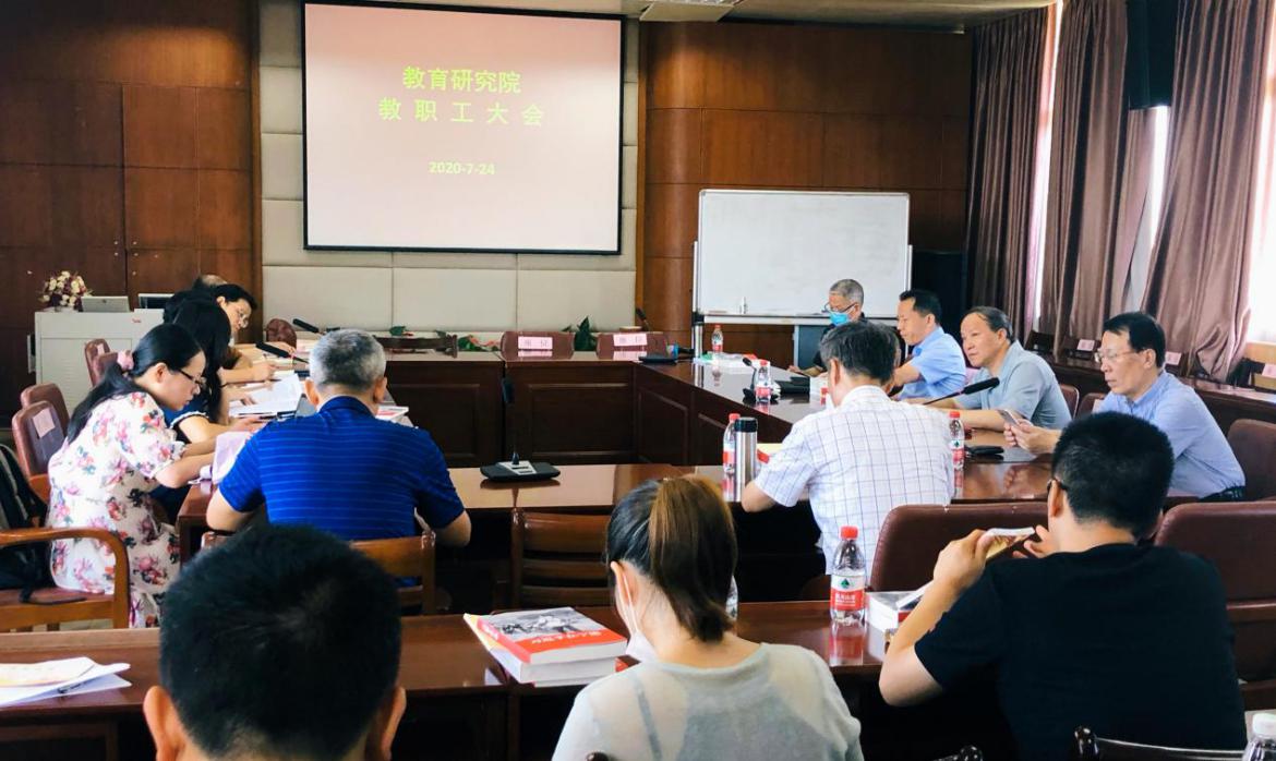 接着,教研院各所所长从人才培养、科学研究、获奖情况、社会服务、学科建设等方面汇报了本所教师一学年来的努力和成果,并提出各所新学年的工作计划。王洪才副院长对教学工作进行了总结,他谈到,我院线上教学的开展效果良好,对非全日制学生的教学与改革很有帮助,同时希望知名教授在研究生招生等工作中更好地发挥学术把关的作用。覃红霞副院长从教研院项目经费、科研工作、学术例会等方面进行了总结和汇报,肯定了2019年我院教职工取得的成绩,鼓励教师们积极申请省社科项目。傅伯奇副书记重点汇报了疫情防控、学生错峰返校及毕业生就业情况,对我院接下来的暑期安全防范以及秋季开学工作进行了安排部署。