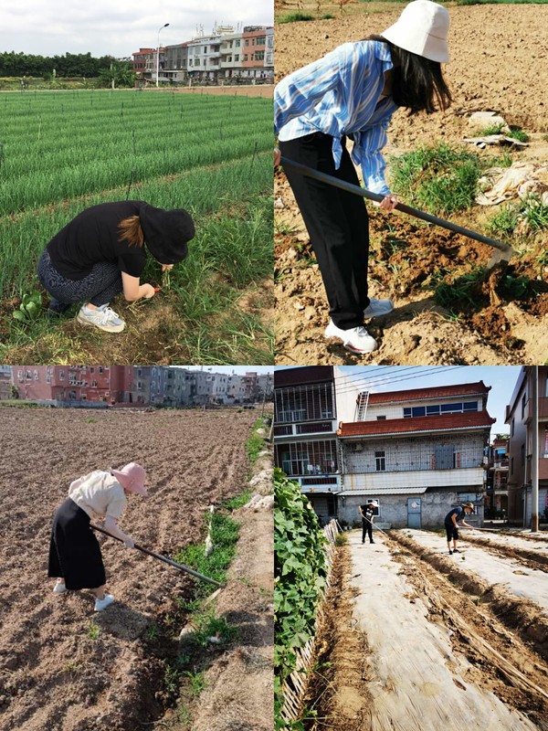 目前,这片土地已经经历过了一次收获,马上就要进行第二次播种,实践队的任务是为它翻土、拔草。在进行劳作之前,郑主任请了一位老师为实践队队员讲解、做示范。老师是一位地地道道的老农民,黝黑的皮肤、精壮的体格成为了“专业”的印证。他蹲在田埂边,拿着镰刀,一边示范割草,一边告诉队员们,拔草是为了不让杂草争夺作物的养分,翻土则是为了增加土壤的透气性,有利于种子的发芽。在他的指导下,实践队员们“各司其位”,承担起翻土、拔草、除地膜等不同的任务。在实践队伍中,大部分同学是第一次下地,一开始还略显生疏,动作不规范、要点不熟练等现象时有发生,而随着劳动进程的推进,实践队队员们渐渐摸索出一些经验,工作效率也大大提升。时至晌午,气温升高,队员们已经汗流浃背,弯腰起身的动作变得越发艰难,手上的水泡隐隐作痛,脚步也略显沉重,每个人都深刻体会到了干农活的艰辛。还有队员不禁感叹道:“原来我们吃的粮食被种出来是这么的不容易!”可以说,志愿者们的到来是一场“赶巧“,他们洒下的汗水既是对最后的土地的深情告别,也是对乡村转型的美好希冀。