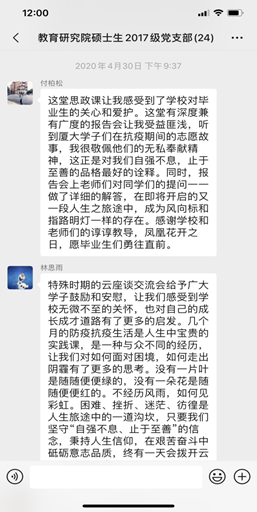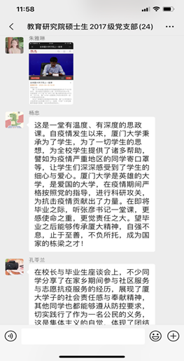 2020年4月30日,厦门大学围绕“明辨笃实坚定自信 担当进去健康成才”主题开展“书记云见面”——张彦教授与毕业班同学座谈交流活动。在举国抗疫的特殊时期,厦门大学党委书记张彦为全体厦大学子上一堂课,引导广大学生勇敢积极面对困难、经历风雨收获成长,通过线上直播的形式校与50位学生代表通过随会系统进行交流,本次线上交流活动分享了同学们返校后生活、学习与毕业就业等急需信息,同时鼓舞了同学们返校复学的士气,坚定了大家打赢这场抗疫阻击战的信心。作为毕业班学生,教育研究院硕士生2017级党支部组织全体党员准时参加了此次活动,与会同志24名。会后,支部同志在线上开展了积极讨论,纷纷发表观看感想。