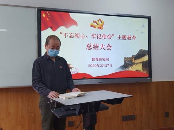 院党委书记郑冰冰在总结讲话中,从有效做法、主要成效、经验启示、存在问题和下一步工作等方面全面总结了教育研究院“不忘初心、牢记使命”主题教育的开展情况。院党委聚焦“不忘初心、牢记使命”主题教育,通过开展主题教育,院党员干部在“理论学习有收获、思想政治受洗礼、干事创业敢担当、为民服务解难题、清正廉洁作表率”五方面取得显著成效,进一步树牢“四个意识”,坚定“四个自信”,做到“两个维护”,更加自觉地在思想上政治上行动上同以习近平同志为核心的党中央保持高度一致。