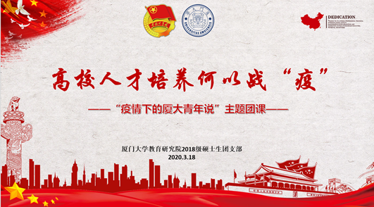 为将疫情防控期间青年正能量转化为教育资源,引导团员青年以实际行动为抗击疫情贡献力量,3月18日下午,教育研究院2018级硕士生团支部立足专业特色,以网络视频会议的形式组织开展了“疫情下的厦大青年说——高校人才培养何以战‘疫’”主题微团课。厦门大学高等教育发展研究中心主任、教育研究院特聘教授刘振天,院党委副书记傅伯奇,教育研究院挂职校团委副书记文静副教授以及院团委书记魏艳出席会议,2018级硕士生团支部全体团员参与了活动。本次活动由2018级硕士生团支部书记郑雅倩主持。