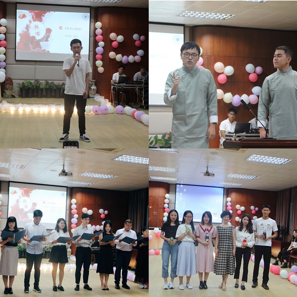 开场舞《失恋阵线联盟》向大家展示了新生们的热情与活力,也带动了全场的氛围;由刘曦东、郭玉婷、欧妍、陈凤菊四名19级硕士生合唱的歌曲《遇见》,让我们感激相遇于此;19级硕士生万心怡、高欣和汪笑笑朗诵的《少年中国说》,让我们看到了梁启超先生笔下的少年中国——“美哉我少年中国,与天不老!”;感受到了中国少年的使命担当——“故今日之责任,不在他人,而全在我少年”;深刻体会到社会主义中国亦需要我们中国少年承负起国之重任,积极进取,乐观勃发,共同促进祖国繁荣昌盛!其后,刘周灵润、钱璐遥上演的小品《廉价航空》,一开演便逗笑全场,唯妙唯肖的演技让台下师生笑声不断。