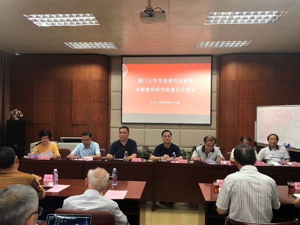2019年7月16日上午,厦门大学党委第四巡察组巡察教育研究院党委意见反馈会在教育研究院502会议室召开。厦门大学党委常委、副校长邱伟杰,厦门大学纪委副书记、纪委办主任、巡察办主任林金枝,校第四巡察组组长、信息学院党委书记刘弢,副组长、能源学院党委书记孙梓光,副组长、财务处原副处长张莹,校基层党建工作联络员林自和出席了会议。会议由教育研究院党委书记郑冰冰主持。教育研究院领导班子成员、全体在职教职工和部分退休教师代表参加了会议。