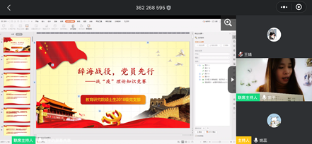 为深入贯彻落实党中央和校党委的要求,创新党支部工作模式,加强基层党组织建设,3月11日下午3点整,教育研究院硕士生2018级党支部以线上视频会议的形式开展了战“疫”理论知识竞赛。学校宣传部陈瑶华老师、硕士生2018级党支部全体党员参加活动。活动由2018级硕士生党支部书记郭平主持。