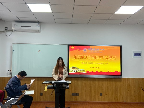 为深入贯彻落实习近平总书记在“不忘初心、牢记使命”主题教育工作会议上的重要讲话精神,全面把握“守初心、担使命,找差距、抓落实”的总要求,进一步增强基层党支部凝聚力和战斗力,加强学生党员党性修养,把初心和使命融入党建和党员发展中。2019年12月4日上午10:00,教育研究院硕士生2018级党支部在学院210教室召开组织生活会,开展民主评议党员,会议由党支部书记郭平主持,全体党员都参与了会议,教育研究院党委委员乔连全老师出席了会议。