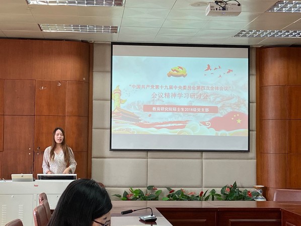 2019年11月4日上午11:20,教育研究院硕士生2018级党支部在院楼502会议室召开学习贯彻第十九届中央委员会第四次全体会议精神学习研讨会,党支部全体党员参加了会议,会议由党支部书记郭平主持。