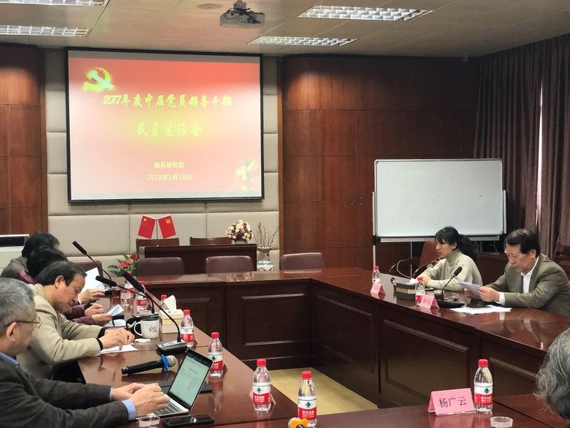 按照《厦门大学关于认真开好2017年度中层以上党员领导干部民主生活会的通知》要求,2018年1月19日上午,教育研究院中层党员领导干部召开以“认真学习领会习近平新时代中国特色社会主义思想,坚定维护以习近平同志为核心的党中央权威和集中统一领导,全面贯彻落实党的十九大各项决策部署,全面加强党的领导和党的建设,加快一流大学和一流学科建设,实现高等教育内涵式发展”为主题的巡视专题民主生活会。副校长邬大光,学校第一督导组肖丽玮同志到会指导,教育研究院部分研究所所长、工会主席列席了会议,会议由院党委书记郑冰冰主持。