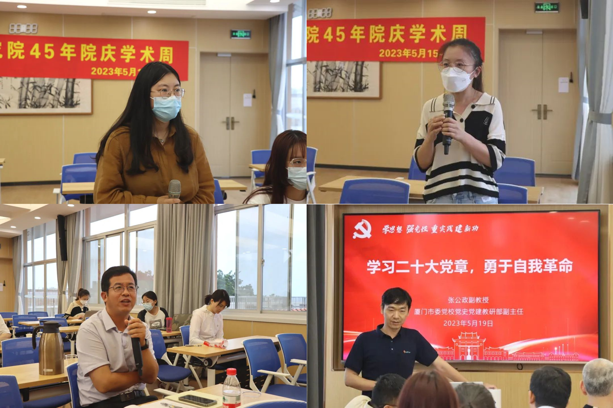 2023年5月19日,院党委在黄宜弘楼502报告厅开展理论学习中心组(扩大)第二次专题学习暨第二次集体学习交流活动。中共厦门市委党校党史党建教研部副主任张公政副教授作题为《学习二十大党章,勇于自我革命》辅导报告。院党委理论学习中心组成员,全体党员参加学习交流,报告由副院长郭建鹏主持。