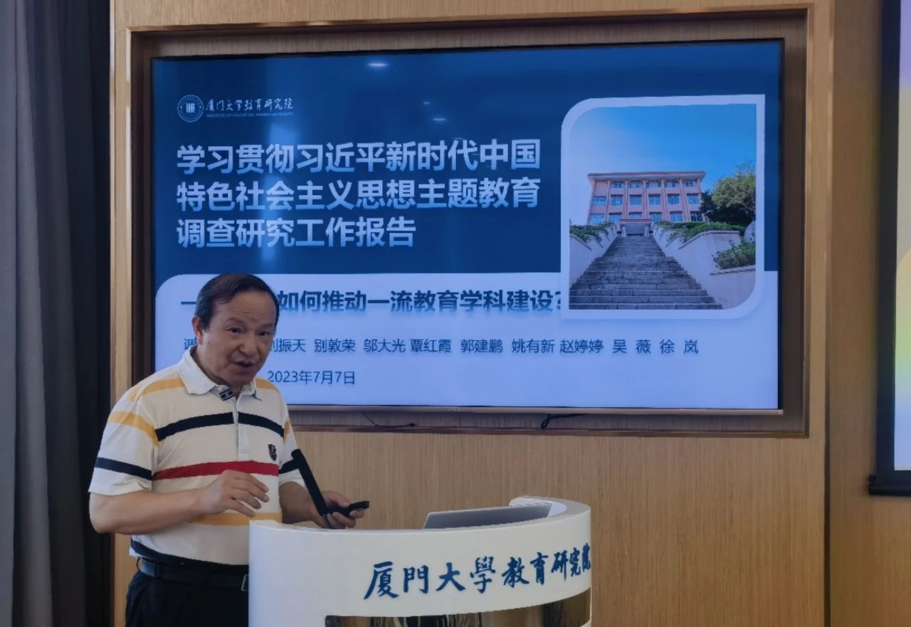 刘振天在总结讲话中指出,主题教育开展以来,院党委始终以习近平新时代中国特色社会主义思想为指导,系统谋划、精心部署,大兴调查研究,由党政领导班子成员分别领题调研,充分运用党的创新理论破解事业发展难题,初步形成了一系列高质量的调研成果。他表示,将严格落实指导组的指导意见和工作要求,继续深化研究,把调研成果转化为破解我院发展难题的实招、硬招,切实解决我院一流学科建设的瓶颈问题,确保主题教育“调”有所得、“研”有所获,为推进中国式教育现代化建设贡献“厦大智慧”。