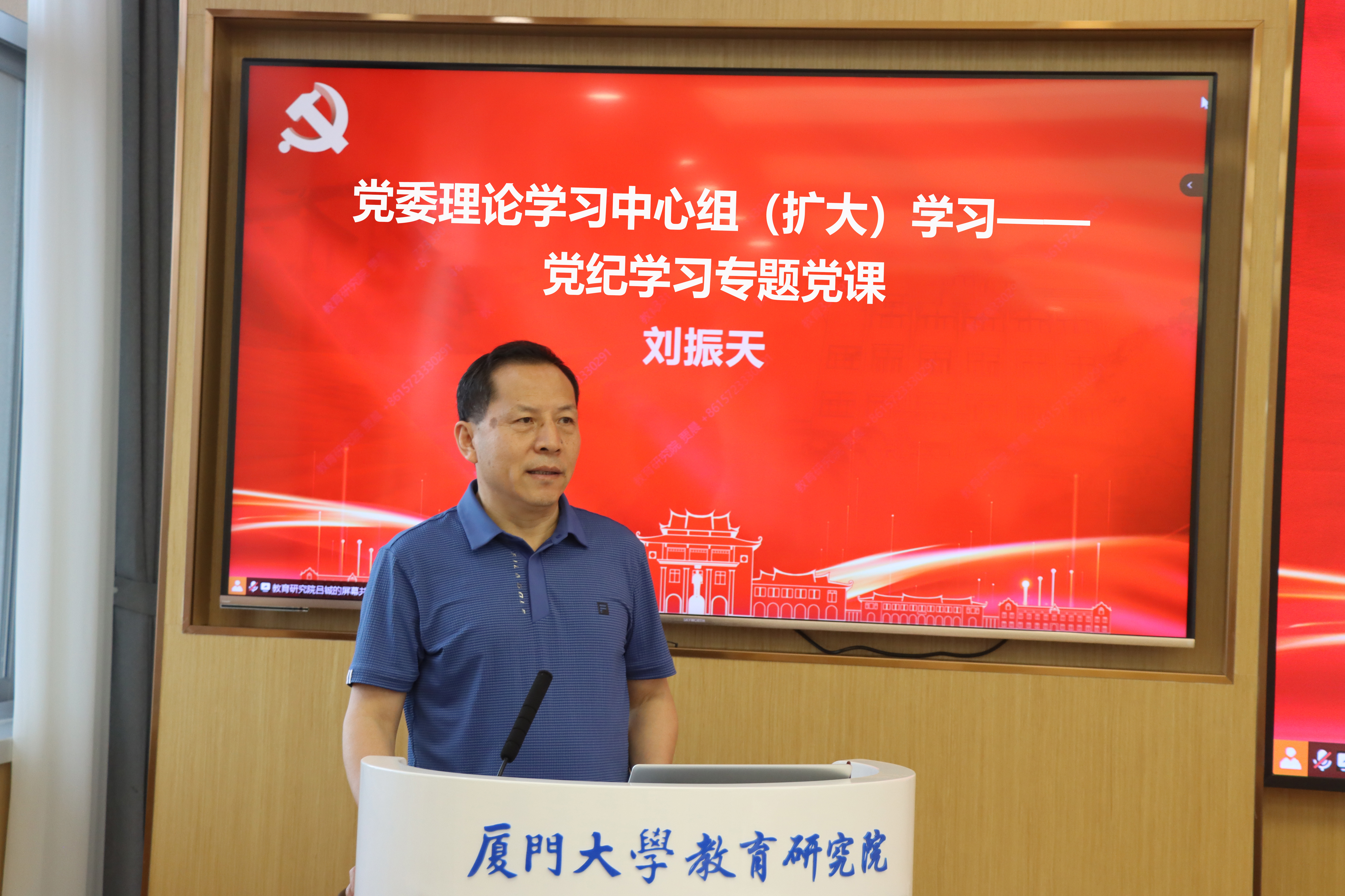 4月22日下午,教育研究院党委召开党纪学习教育动员会暨党委理论学习中心组(扩大)学习,深入学习贯彻党中央关于在全党开展党纪学习教育的有关要求,对全院开展党纪学习教育进行动员部署,并开展党纪学习教育专题党课和警示教育。会议由院党委书记刘振天主持,院党政领导班子、党委委员、全体师生党员及积极分子在黄宜弘楼502、211、210、401室参加会议。