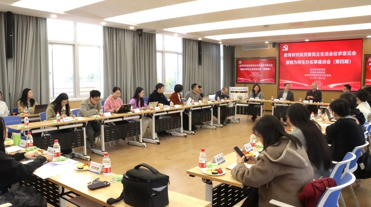 为深入学习贯彻党的二十届三中全会和全国教育大会精神,落实立德树人根本任务,做好服务育人工作,把学习教育成效转化为师生工作实绩,2024年12月25日下午,教育研究院党委民主生活会征求意见会暨我为师生办实事座谈会(第四期)在黄宜弘楼502报告厅举行。会议由院党委书记刘振天主持,党委副书记姚有新、副院长赵婷婷、王树涛,院办公室、团委负责人、校学生事务助理代表以及二十余名我院师生代表参加了此次座谈会。
