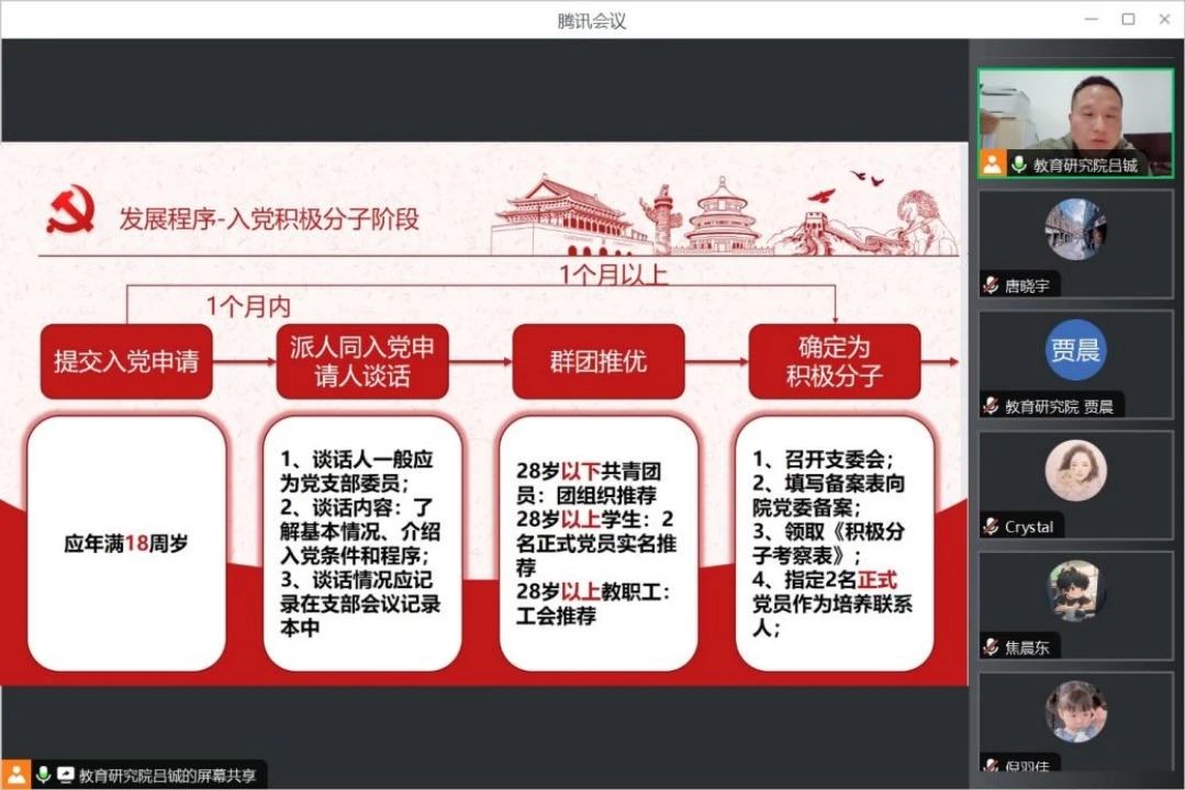为深入贯彻党的二十大、二十届三中全会精神和习近平总书记关于教育的重要论述,全面落实校党委工作部署,不断提升党支部建设规范化水平和党员发展质量,2025年3月10日,教育研究院党委召开党支部书记工作例会,会议以线上形式举行,各学生党支部书记及支委共计20余人参会,会议由党务秘书吕铖主持。