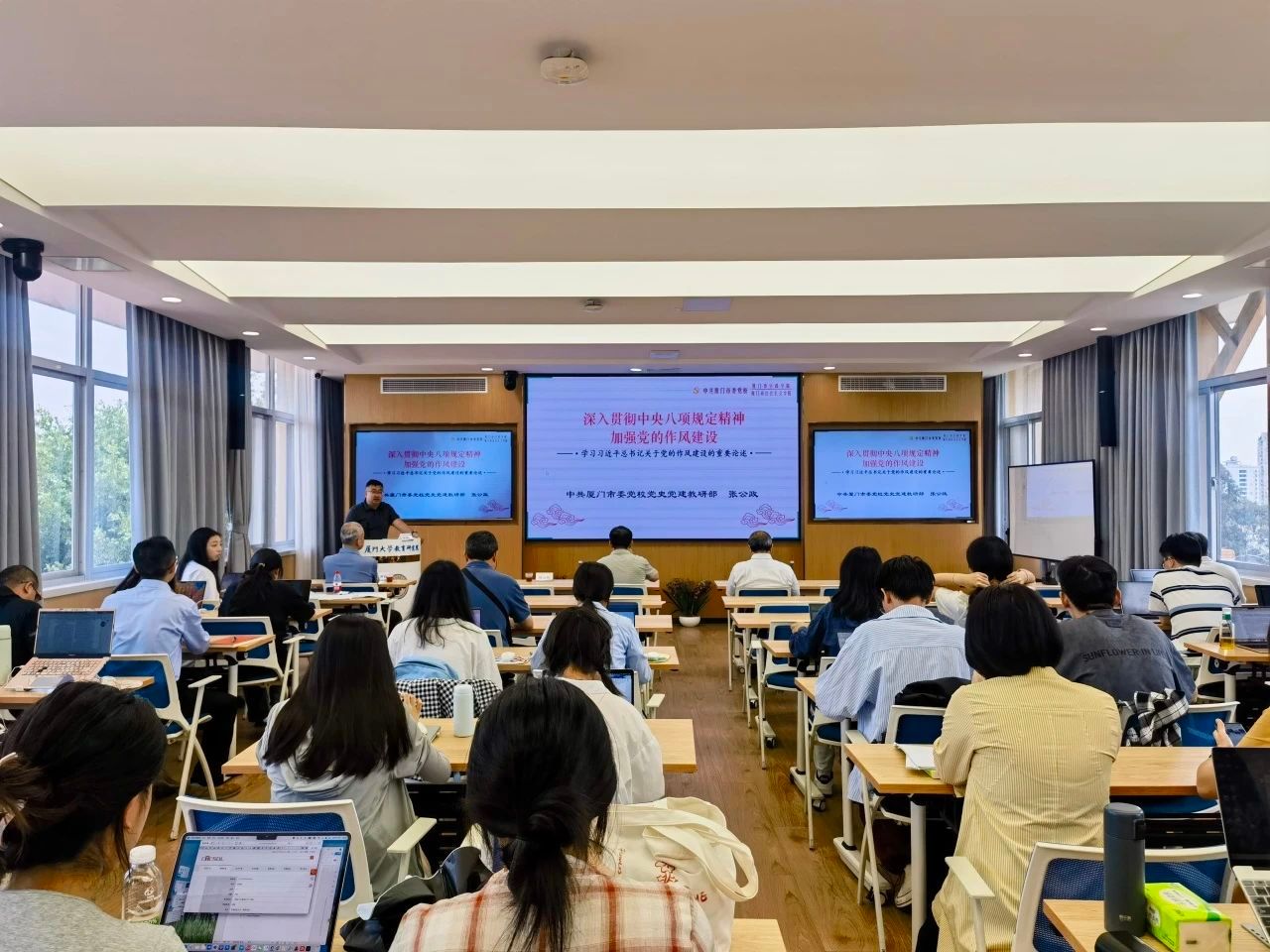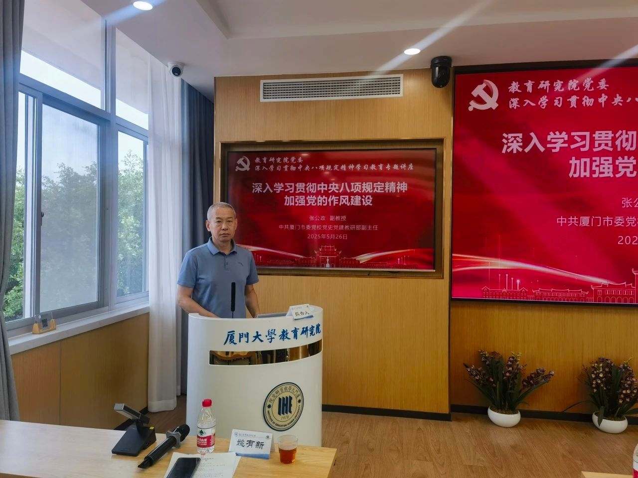 2025年5月26日下午,教育研究院在黄宜弘楼502报告厅开展深入贯彻中央八项规定精神学习教育专题讲座。中共厦门市委党校党史党建教研部副主任张公政副教授为教育研究院全体师生作题为《深入学习贯彻中央八项规定精神,加强党的作风建设》报告。报告由院党委副书记姚有新主持,院党政领导班子、全体师生党员及积极分子在黄宜弘楼502及分会场参加学习。