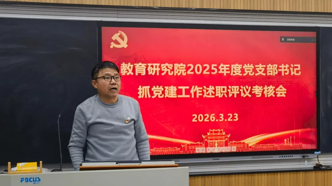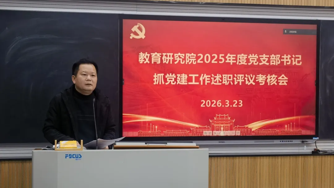 为深入学习贯彻习近平新时代中国特色社会主义思想,贯彻落实习近平总书记关于树立和践行正确政绩观的重要论述精神,全面加强党的建设,根据校党委的统一部署,3月23日下午,教育研究院在黄宜弘楼401报告厅召开2025年度党支部书记抓党建工作述职评议考核会。校党委党建联络员蔡郑伟到会指导。会议由院党委书记邹江涛主持,院党委委员、组织员、团委书记、师生党支部书记及支委参加会议。