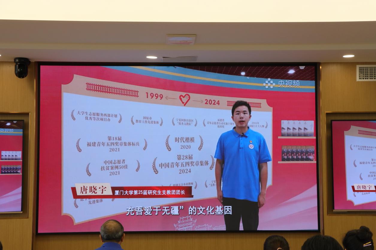我院2024级硕士生唐晓宇同学在微党课中分享了作为闽宁协作厦门大学宁夏研究生支教团成员赴宁夏支教的工作经历和感受,他表示青年学子应该牢记习近平总书记“坚定不移听党话、跟党走,争做有理想、敢担当、能吃苦、肯奋斗的新时代好青年”的嘱托,扎根基层一线,投身科研报国,用实际行动书写无悔青春答卷。