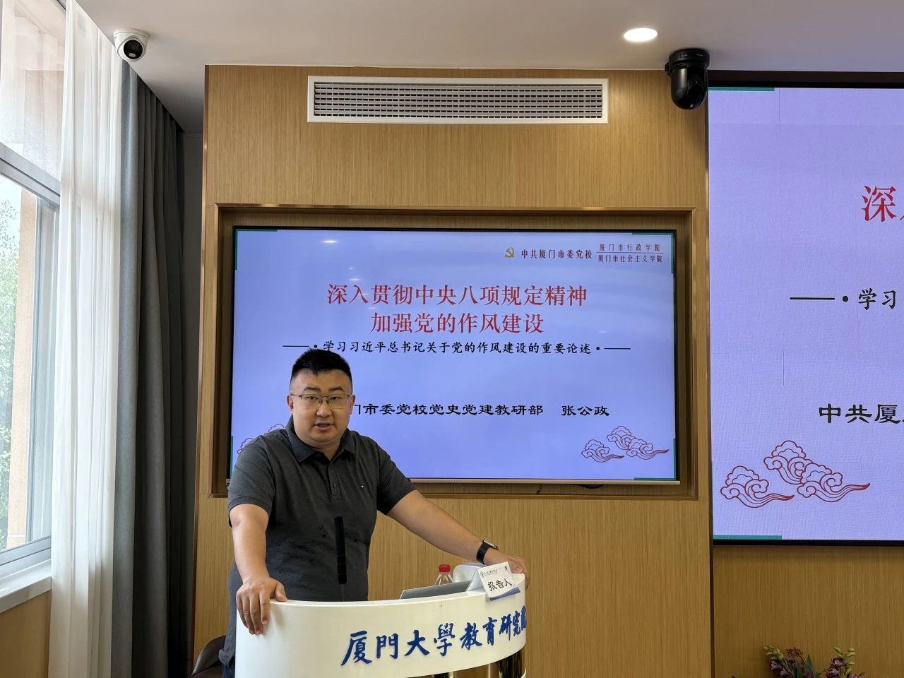 2025年5月26日下午,教育研究院在黄宜弘楼502报告厅开展深入贯彻中央八项规定精神学习教育专题讲座。中共厦门市委党校党史党建教研部副主任张公政副教授为教育研究院全体师生作题为《深入学习贯彻中央八项规定精神,加强党的作风建设》报告。报告由院党委副书记姚有新主持,院党政领导班子、全体师生党员及积极分子在黄宜弘楼502及分会场参加学习。