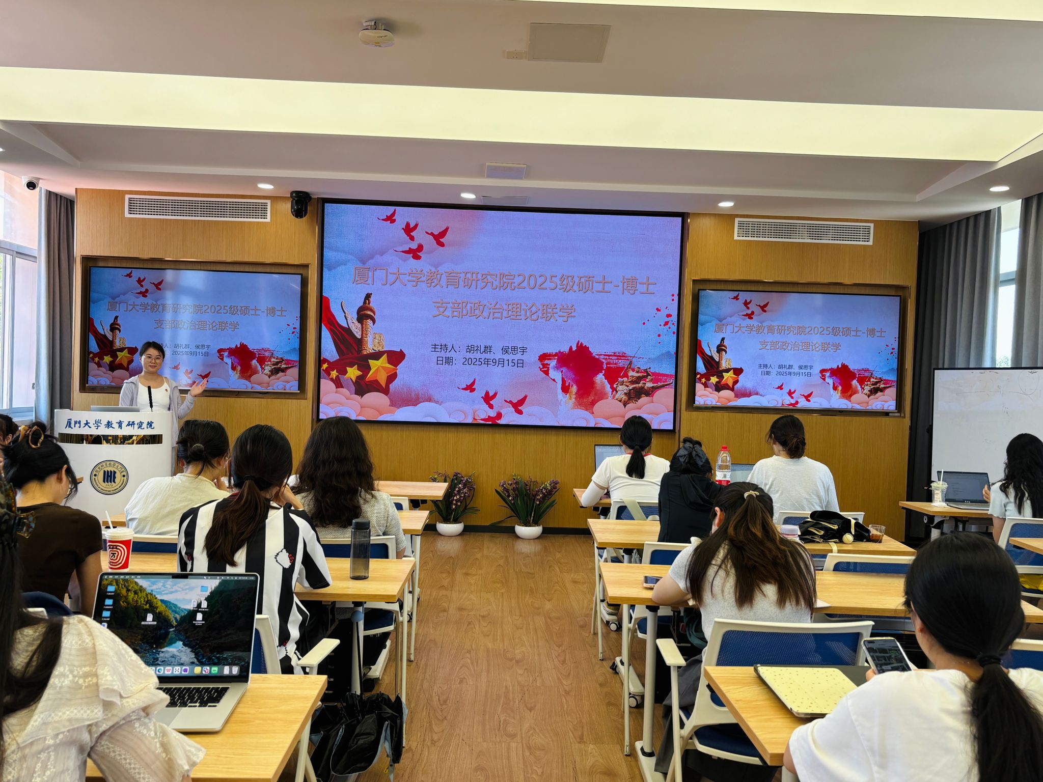 2025年9月15日,为深入学习贯彻党的创新理论,加强党员思想政治教育,根据院党委统一部署,教育研究院2025级博士生党支部、2025级硕士党支部在黄宜弘楼502报告厅联合开展主题党日活动,进行政治理论联学。教育研究院2025级博士生党支部书记胡礼群主持联学活动。