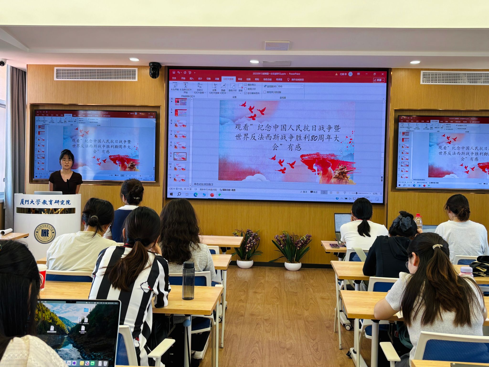 2025级硕士生党支部王佳怡谈到:十年前我在天安门广场亲历阅兵的庄严场面,十年后我在厦大线上观看盛况,深切感受到国家实力的日益强大和中国军队捍卫和平的坚定决心。作为新时代青年,我们更应砥砺奋进,把青春奋斗融入中华民族伟大复兴的伟大征程。