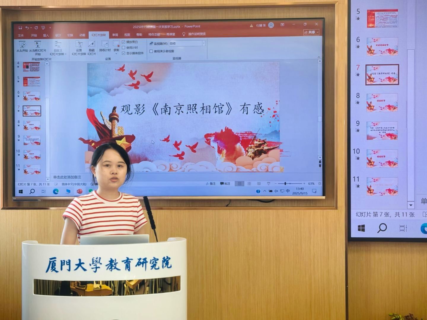 2025级硕士生党支部叶晓琴谈到:我的家乡大田,正是电影主人公苏柳昌的原型罗瑾晚年隐居的地方。他冒死保存日军暴行照片、突破重重封锁将‘京字第一号’证据呈递世人的事迹,令我深受震撼。他是真正的历史守护者和传承者,是民族的英雄。在抗战胜利80周年的今天,我们更应铭记历史、珍惜和平,以实干与担当为中国式现代化贡献青春力量。