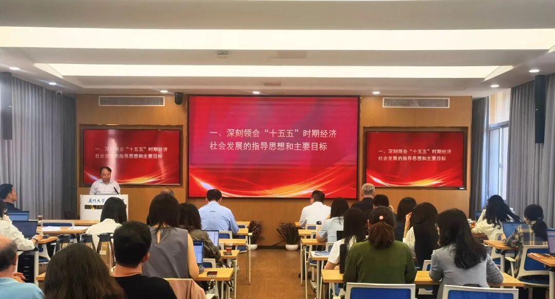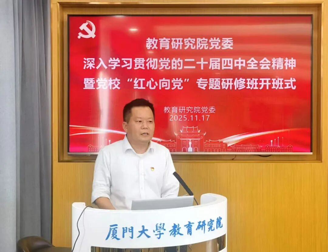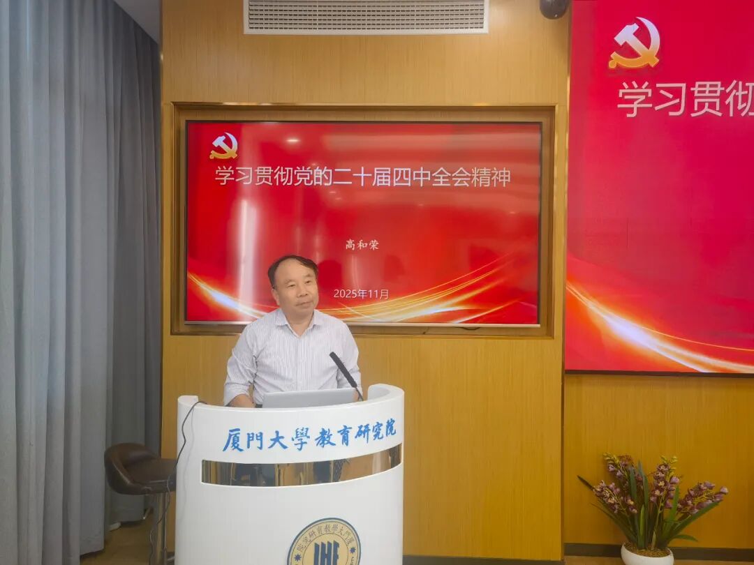 2025年11月17日下午,教育研究院党委学习贯彻党的二十届四中全会精神专题报告会暨党校“红心向党”2025年专题研修班开班式在黄宜弘楼502报告厅顺利召开。本次活动既是研究院落实学校党委学习宣传贯彻全会精神工作部署的重要开篇,也是院党校强化思想引领、锤炼党性修养、凝聚奋进力量的重要举措。厦门大学党委常委、宣传部/教师工作部部长、厦门大学学习贯彻党的二十届四中全会精神宣讲团成员高和荣教授受邀作专题报告。院党政领导班子、党委理论学习中心组成员及全体师生参加会议,院党委书记邹江涛主持会议。