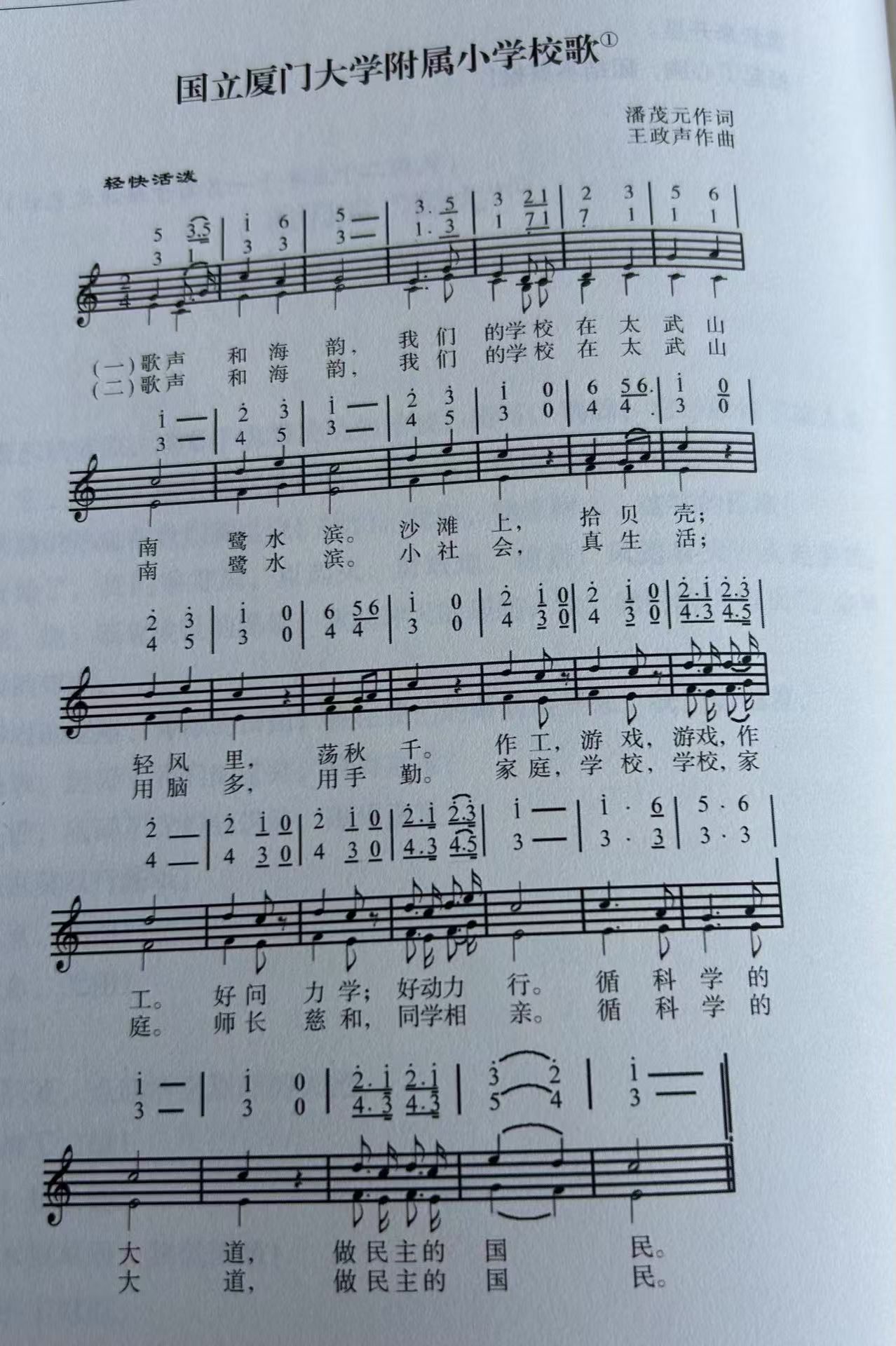 歌声和海韵,我们的学校在太武山阴鹭水滨。沙滩上,拾贝壳;轻风里,荡秋千。作工、游戏,游戏、作工;好问勤学、好动力行。循科学的大道,做民主的国民。