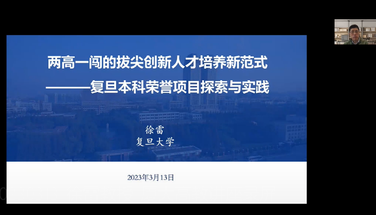 随后,徐雷教授重点介绍了拔尖创新人才培养新范式的复旦方案——本科荣誉项目。该项目以“优秀是闯出来的”“人人皆可成才”为教育理念,具有高开放管理、高挑战质量体系和闯关式设计三大特色。具体做法在于创新培养质量观,培养学生知识硬功与坚持韧劲;创新教学管理,使荣誉方案与常规培养方案并行,让学生自主选择培养路径。徐雷教授表示,本科荣誉项目有效解决了以往选拔评价方式不合理、培养路径少和挑战度低等问题,锻造了师生共同追求卓越、挑战自我、笃志笃学的品质,能够让拔尖学生脱颖而出;同时有力地推进课堂教学改革,推动高水平教材建设,健全基层教学组织;此外,荣誉课程从基础学科辐射到所有学科,受到了社会各界的广泛关注。
