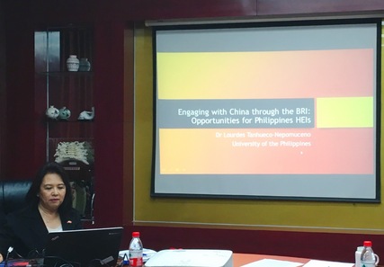 5月21日下午,菲律宾大学孔子学院外方院长Lourdes Tanhueco-Nepomuceno教授来到我院,为我院师生开设了题为“Engaging with China’s Belt and Road Initiative (BRI): Opportunities for Philippine Universities”的讲座。该讲座主要探讨了在全球化背景和中国“一带一路”倡议下,菲律宾高等教育机构面临的机遇和挑战,以及中菲高校如何合作推进一带一路沿线高等教育发展的问题。本次讲座由吴薇教授主持,我院蔡秀英助理教授、部分博士生和硕士生参加了本次讲座。