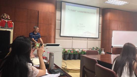 紧接着,陈兴德副教授引用张楚廷、冯友兰等名家观点,提出“文化自觉”的基本内涵为:明白自身文化的来历、了解自身文化的特色、掌握人类文化发展趋向、主动适应文化的变革。与此同时,陈兴德副教授认为文化自觉体现为四个意识:文化寻根意识、文化认同意识、文化批判意识和文化创新意识。而在当代,高等教育发展中的“文化自觉”何以成为问题?陈兴德副教授认为近代中国有着空前的“文化认同危机”,蔡元培先生曾提出国民性格由“自大”向“自弃”沉沦的论断,这样一种心理过程的发展正表明中国人从自身认同走向文化撕裂,而由此产生的文化焦虑导致了高等教育发展困难重重。那么,在世界一流大学建设背景下,我们该如何进行文化反思呢?陈兴德副教授总结学界关于中国高等教育现代化的“乐观派”及“悲观派”两种观点,认为在新时期高等教育改革中要倡导文化自觉,即要做到重塑中国高等教育的文化认同、以“三个面向”提升文化自觉。