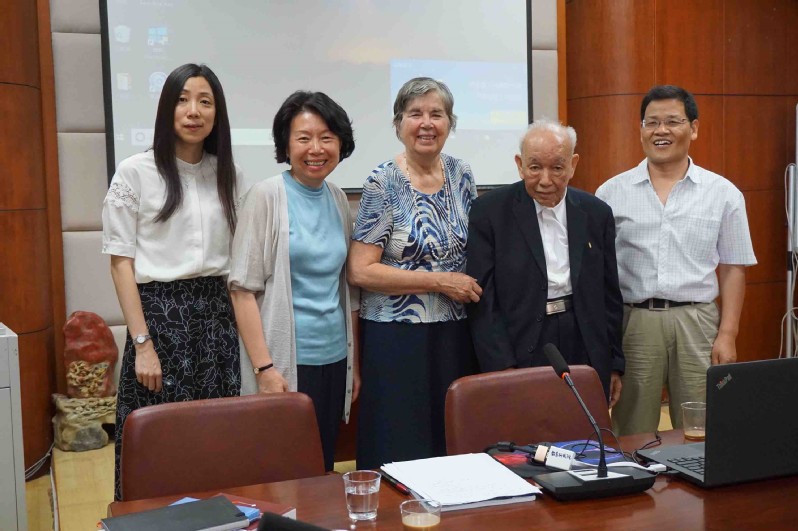 Professor Pan Maoyuan at a salon for graduate students led by Professor Wang Hongcai (on his left) and attended by Ruth Hayhoe, Julia Pan and Wu Wei on May 16, 2018.