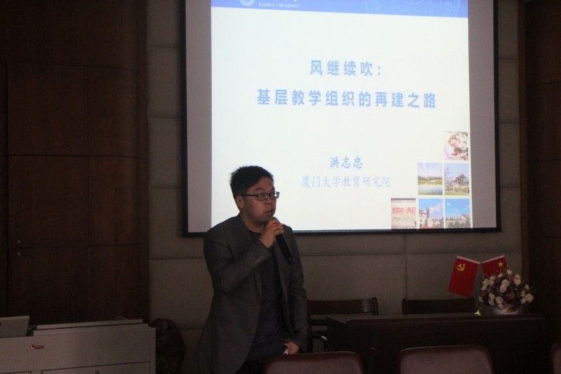 2018年3月26日,在春意盎然的时节里,我院洪志忠助理教授为师生们带来了一场富有诗意的学术报告,题为“风继续吹:基层教学组织的再建之路”。潘懋元先生、郑冰冰书记、别敦荣教授、覃红霞教授、陈兴德副教授、郑宏副教授、吴薇副教授、郭建鹏副教授、吴凡助理教授以及我院众多硕博研究生参加了本次学术例会。