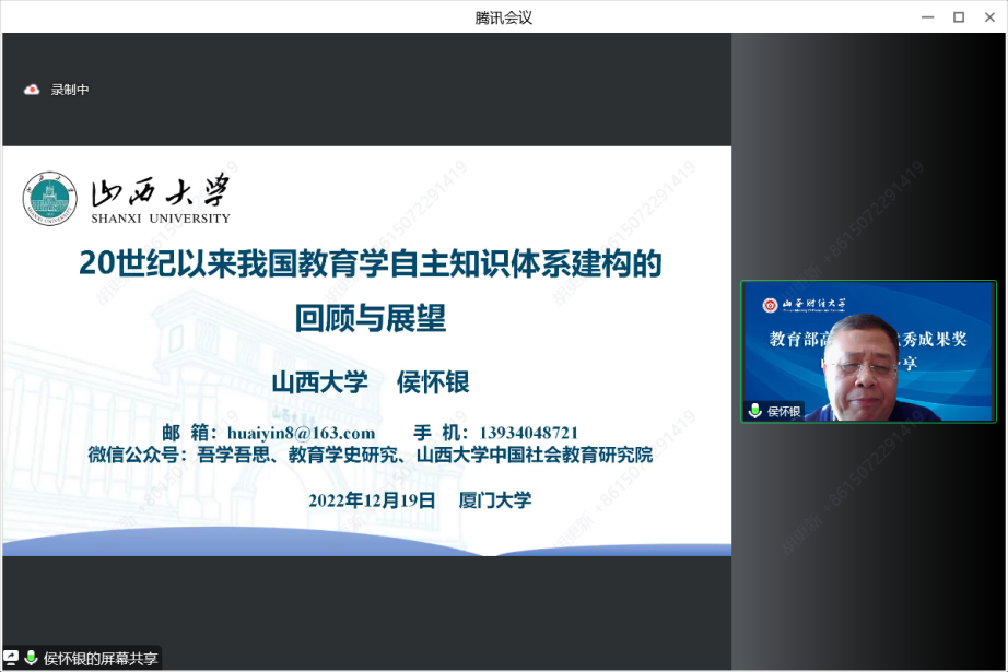 2022年12月19日上午,山西大学侯怀银教授为我院师生作了题为《20世纪以来我国教育学自主知识体系建构的回顾与展望》的学术报告。刘振天教授等两百多位师生通过线上方式参会,例会由王洪才副院长主持。