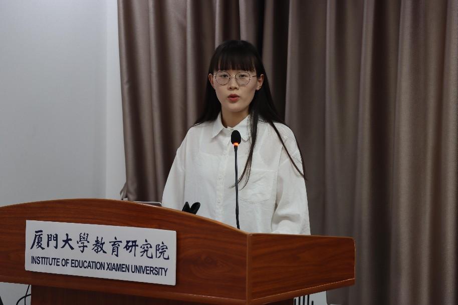 2019级硕士生张晶晶作题为《博士研究生对读博经历的意义建构研究》的报告。她运用意义建构理论,对28位受访者进行深入访谈,得出情怀先行的批判主义者、脚踏实地的经验主义者、世事洞察的理想主义者、逻辑缜密的适应主义者等四种意义建构模式,并提出建议。