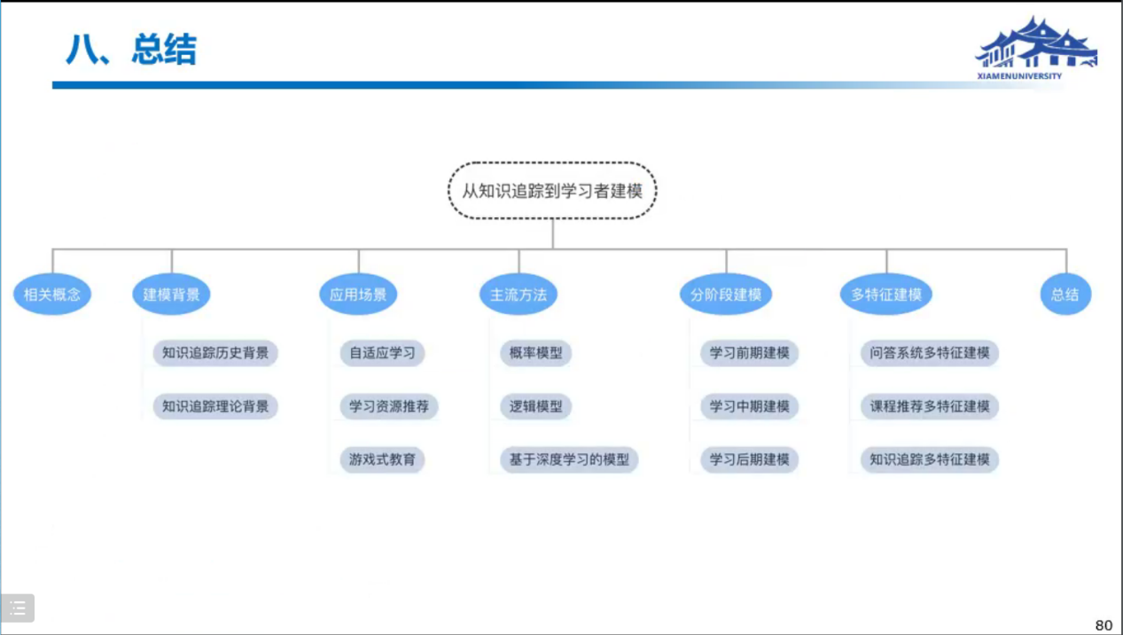 从对学习者进行“因材施教”的个性化角度出发,以知识追踪为切入点,本场报告深入讨论了从知识追踪到学习者建模的相关概念、发展背景、应用场景、主流建模方法和分阶段、多特征学习者建模。报告伊始,林凡老师介绍了教育数据挖掘(EDM)、人工智能赋能教育产业(AIED)、学习分析(LA)、学习者建模(LM)和知识追踪(KT)等相关概念,展现了知识追踪的精细化、智能化、深度化特点。在掌握学习、机器学习、深度学习的基础上,知识追踪目前已经发展出了状态模型、深度学习网络和认知诊断等技术。而且,知识追踪的应用场景也十分广泛,涵盖了自适应学习、教育测评、学习资源推荐、游戏式学习等多种学习情境,用以更好地掌握学习者的学习状态和更快地捕捉学习者的学习特点与不足,从而更准确地为学习者提供个性化反馈。在分析知识追踪的不同应用场景后,林凡老师对于现有的知识追踪建模方法重新分类,从而归纳出概率模型、逻辑模型和基于深度学习的模型三种知识追踪的主流建模方法。然而,基于方法的分类仅仅描绘了知识追踪建模的发展现状,却无法勾勒出更加复杂灵活和贴近实际学习需求的未来模型。因此,林凡教授以学习者建模的未来展望结束本场报告,提出了从学习前、学习中到学习后的分阶段学习者建模和涵盖问答系统、课程推荐、知识追踪的多特征学习者建模。