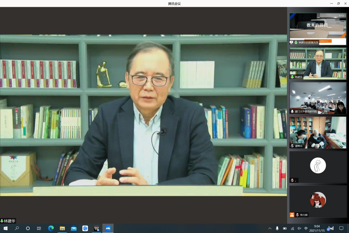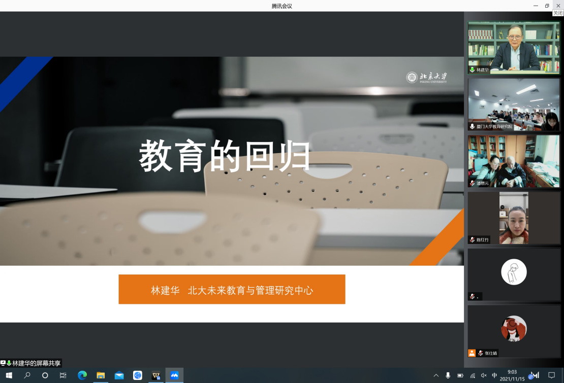 2021年11月15日上午,林建华教授为我院师生作题为《教育的回归》的学术报告。潘懋元先生、别敦荣院长、刘振天书记和覃红霞副院长等师生通过线上线下相结合的方式参加了此次报告。报告会由邬大光教授主持。