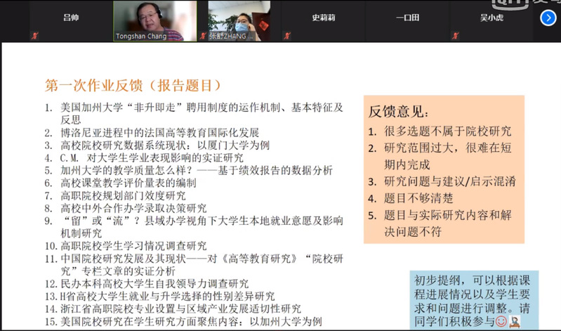 2021年7月2-30日,美国加州大学总校校长办公室院校研究与学术规划处常桐善教授应邀为我院师生开设了小学期的线上国际化课程《院校研究理论与方法》。7月2日上午,院党委书记刘振天教授、院长别敦荣教授和副院长覃红霞教授在开课前与常教授进行了简短的沟通,欢迎常教授在大洋彼岸为我院开课。