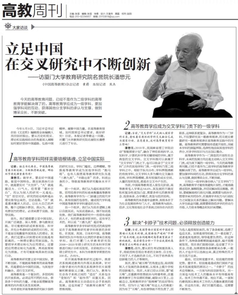 今年5月9日,习近平总书记在给《文史哲》编辑部全体编辑人员回信时指出,要从历史和现实、理论和实践相结合的角度深入阐释如何更好坚持中国道路、弘扬中国精神、凝聚中国力量。在高等教育领域,如何按照总书记要求,做好研究?日前,中国教育报记者带着这一问题,对厦门大学教育研究院名誉院长潘懋元进行了专访。