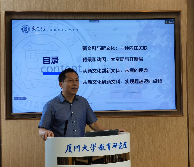 2021年6月7日上午,我院党委书记刘振天教授作题为《新文科建设:新时代中国高等教育“新文化运动”》的学术报告。此次报告是厦门大学新文科系列讲座的第三辑第四讲,受到了师生们的广泛关注和热烈欢迎。潘先生、王洪才副院长、覃红霞副院长等师生通过线上线下相结合的方式参加了此次讲座。厦门大学社科处副处长张随刚主持报告会。