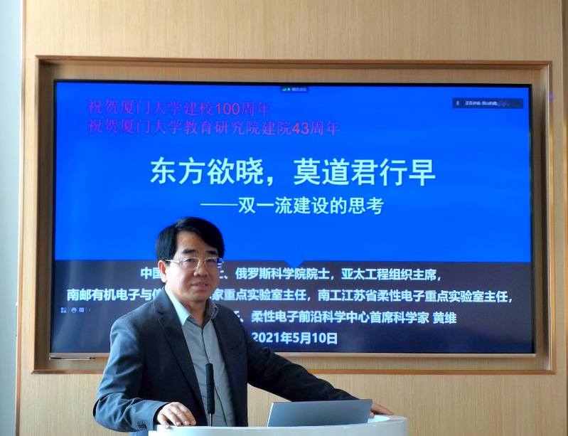2021年5月10日下午,厦门大学高教讲座在教育研究院502教室开讲。中国科学院黄维院士作题为《东方欲晓,莫道君行早——“双一流”建设的思考》的专题讲座。刘振天书记、王洪才副院长、覃红霞副院长等师生通过线上或线下的形式参与了此次讲座。本次讲座由别敦荣院长主持。