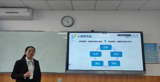 段肖阳同学的报告从研究背景、研究问题、研究思路、研究方法和研究发现五个部分展开。她指出,从发文趋势来看,当下创新创业教育的研究已进入瓶颈期,如何判定创新创业教育成效成为了制约创新创业教育深入开展的关键难题;且通过对已有研究的梳理发现,国内外学术界尚未形成关于创新创业能力概念的统一认识,国内对创新创业能力结构分歧较大且缺少创新创业能力测量工具的开发,因此该研究旨在通过对创新创业能力的构建,来开发出创新创业能力评价指标体系和测量工具以此测量创新创业能力发展现状。她还谈到本次研究主要通过田野、思辨、编制、测试、反思循环式的方法来进行,目前通过4次删改修订,问卷已经初步成型,但仍有改进空间,最后她讲到,目前的量表已经可以作为大学生创新创业能力的测评工具,且为进一步研究大学生创新创业能力水平和影响因素等奠定了基础。