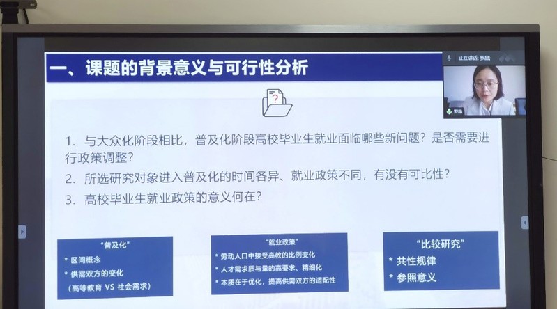 罗晶同学通过线上形式参与本次报告。首先罗晶同学从课题的背景意义与可行性分析、普及化前后五国高校毕业生就业形势分析和普及化前后五国高校毕业生就业政策介绍等方面进行了比较简明扼要的介绍;之后,罗晶同学从我国高等教育进入普及化阶段后高校毕业生就业面临的问题、作为研究对象的五国高等教育进入普及化的时间各异、就业政策不同,有无可比性和高校毕业生就业政策的意义何在等几个问题出发介绍了课题的研究意义;接着,罗晶同学回顾了五国高校进入普及化的时间及前后十年里毕业生的就业形势并对普及化前后五国高校毕业生的就业政策对比分别作了比较详细的介绍与梳理。