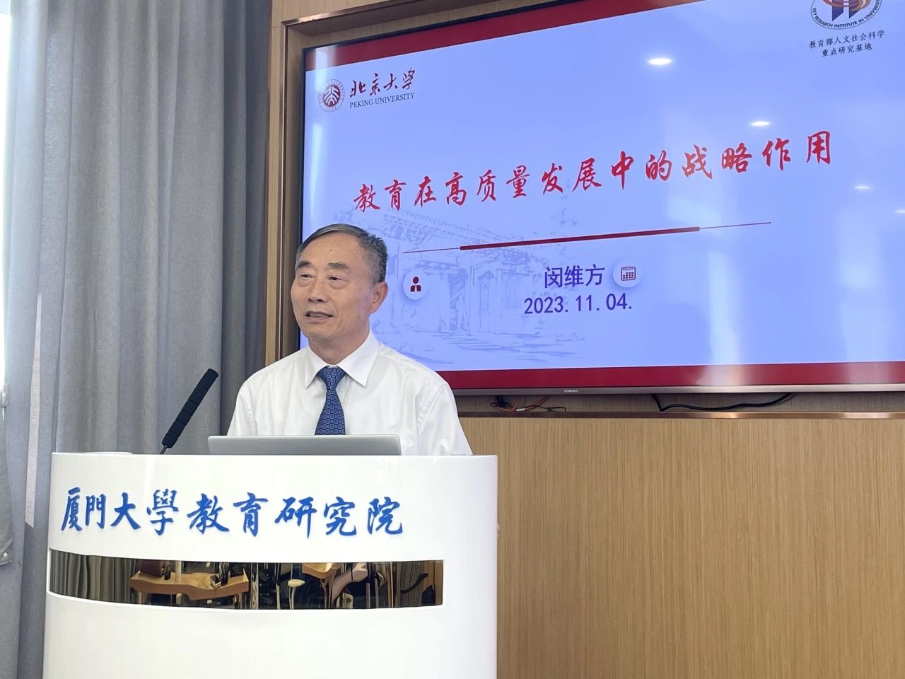 2023年11月4日下午,北京大学原党委书记、博雅讲席教授闵维方为我院师生作了题为《教育在高质量发展中的战略作用》的南强学术讲座。报告会由院长别敦荣主持。院党委书记刘振天为闵维方教授颁发厦门大学南强讲座纪念牌。