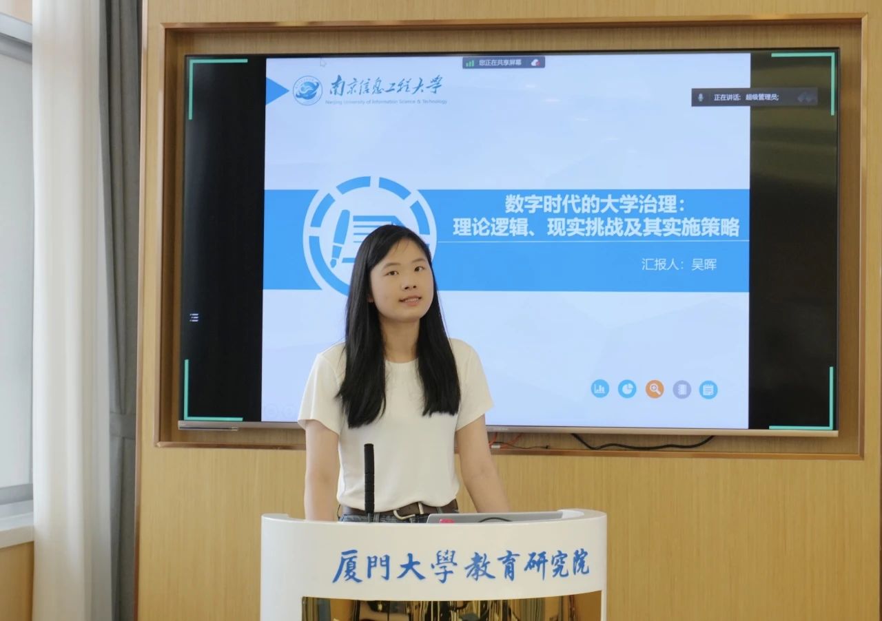 第二场报告是吴晖汇报的《数字时代的大学治理: 理论逻辑、现实挑战及其实施策略》。报告从数字时代下大学治理的内涵与特征出发,指出数字时代的大学治理本质上是通过采集、整合和管理数据实现对大学的现代化治理,为大学可持续发展提供更全面、科学、精细的管理与决策。数字技术具有可采集、可分析、可决策、可依据等特征,但最终都需要服务于大学治理过程,数字时代的大学治理核心应实现从数据到人的转变,坚持以“人”为中心,以“数据”为手段。面临来自治理理念、治理主体、治理工具等方面的现实挑战,大学需从树立人本治理理念、厘清治理主体权责、完善监管机制等方面逐步完善治理体系,使数字技术治理更加规范和制度化。