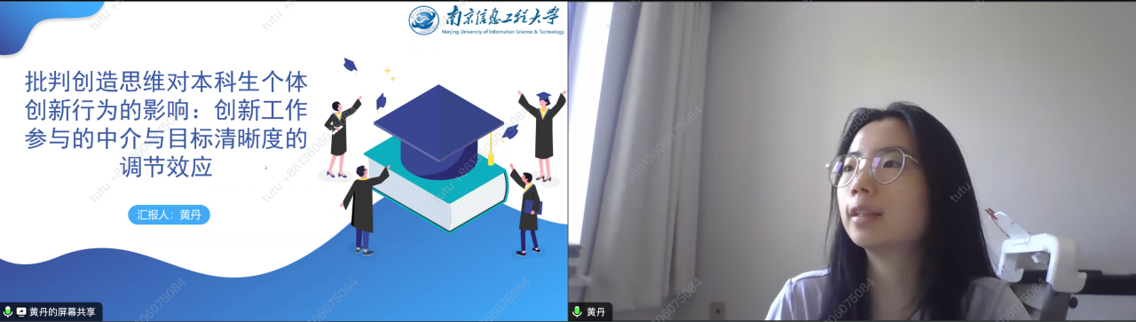 第四场报告是黄丹汇报的《批判创造思维对本科生个体创新行为的影响:创新工作参与的中介与目标清晰度的调节效应》。报告在对批判性思维与创造性思维分别进行概念界定后作了进一步比较,指出二者均需要对事物的特征、类型等进行具体分析和准确推理,以此来触发个体的行为。在分析梳理既有文献后,研究构建了批判性思维、创造性思维、目标清晰度、创新工作参与、个体创新行为的关系模型,通过问卷调查与数据分析的方式逐一验证研究假设,指出应科学构建本科生的目标体系,充分发挥本科生批判创造思维的重要作用,努力提升本科生创新工作参与水平,最终促进个体创新行为的产生。